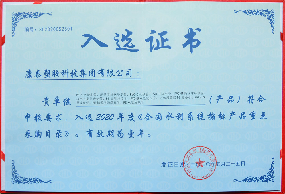 日前,水利部公布了2020年度《全國水利系統(tǒng)招標(biāo)產(chǎn)品重點(diǎn)采購目錄》入選企業(yè)評(píng)審結(jié)果,其中康泰集團(tuán)的薄壁不銹鋼給水管、PE生態(tài)給水管、PVC-O給水管、PVC-M高抗沖給水管、PVC-U雙壁波紋管、給水襯塑復(fù)合鋼管、PVC-U給水管、鋼絲網(wǎng)骨架PE復(fù)合管、MPVE?雙壁波紋管、PE實(shí)壁排污管、PE鋼帶增強(qiáng)螺旋管、PE雙壁波紋管憑借過硬的產(chǎn)品質(zhì)量入選該名單。