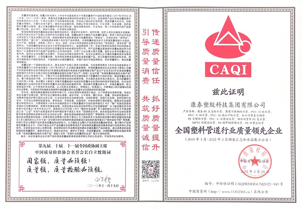 近日,憑借優(yōu)質(zhì)的產(chǎn)品、完善的服務(wù)、良好的口碑,康泰集團(tuán)一舉榮獲中國(guó)質(zhì)量檢驗(yàn)協(xié)會(huì)“全國(guó)塑料管道行業(yè)質(zhì)量領(lǐng)先企業(yè)”、“全國(guó)產(chǎn)品和服務(wù)質(zhì)量誠(chéng)信領(lǐng)先品牌”兩項(xiàng)榮譽(yù)。