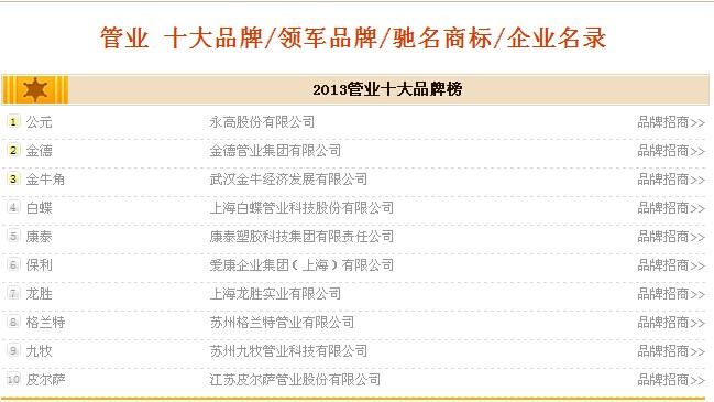 ??? 2014年6月,由品牌排行網(wǎng)主辦的“2014年度中國管業(yè)十大品牌評選” 活動于6月26日完美降下帷幕,康泰塑膠科技集團(tuán)有限公司榮膺“2014年度中國管業(yè)十大品牌”。本次活動以穩(wěn)定大型企業(yè)發(fā)展、帶動行業(yè)品牌化發(fā)展為目標(biāo),以促進(jìn)民族品牌為主題,面向所有行業(yè)所有品牌開放,公開評選。本次評選異常火爆,不但吸引了國內(nèi)近一半的管業(yè)品牌和經(jīng)銷商的參與,同時,也被新浪、網(wǎng)易、人民、新華、中國網(wǎng)等70多家知名網(wǎng)絡(luò)媒體高度關(guān)注,是國內(nèi)管業(yè)行業(yè)少有的大型權(quán)威品牌評選活動。中央電視臺、人民日報等權(quán)威媒體更是爭相報道。本次評選,不但成為管業(yè)領(lǐng)軍者齊聚的盛會,更是眾多國內(nèi)優(yōu)秀品牌嶄露頭角,表現(xiàn)自我的絕佳機(jī)會。經(jīng)過緊張激烈的網(wǎng)上投票、資質(zhì)審核以及消費者商譽(yù)評價。