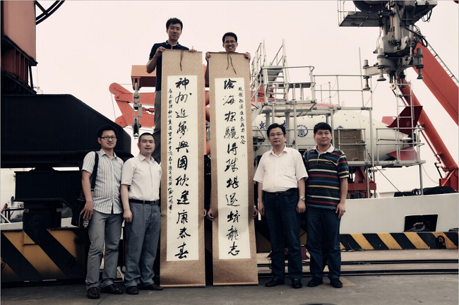??? 2014年6 月24日,正是江南多雨時(shí)節(jié)。素有魚米之鄉(xiāng)美譽(yù)的無錫城在一番新雨洗滌之后更顯得清新秀麗,味韻雋永。這一日,應(yīng)國(guó)家深?;毓芾碇行难?qǐng),康泰集團(tuán)總裁特別助理兼品牌總監(jiān)鄭光鏵受林總裁委托,聯(lián)袂中國(guó)著名書法大師林嶠老師以及“蛟龍?zhí)枌?duì)聯(lián)征集活動(dòng)”一等獎(jiǎng)得主渠芳慧先生抵達(dá)江陰港,一起為蛟龍?zhí)柍龊将I(xiàn)禮祝賀,并零距離參觀了蛟龍?zhí)柹顫撈鳌?guó)家深?;毓芾碇行母敝魅渭孓k公室主任李直東及國(guó)家深?;毓芾碇行恼猩剔k主任馬廣寧、副主任范道偉等領(lǐng)導(dǎo)熱情的接待了鄭總一行。