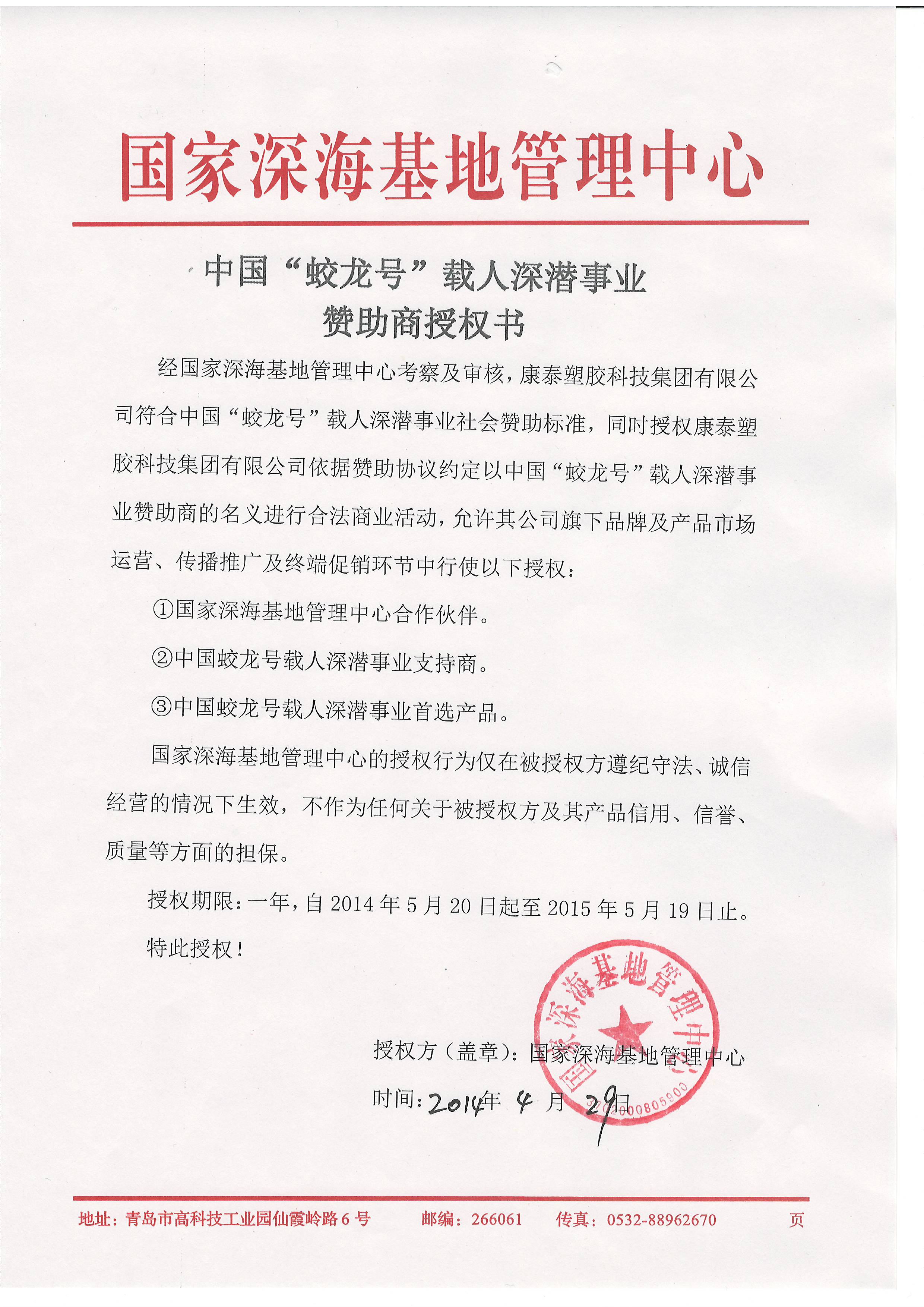 ??? 經(jīng)過近半年嚴(yán)格評估,5月19日,康泰管業(yè)通過國家深?;貙徍?,當(dāng)選為中國“蛟龍?zhí)枴陛d人深潛事業(yè)首選產(chǎn)品,并被授予中國“蛟龍?zhí)枴陛d人深潛事業(yè)贊助商稱號。蛟龍?zhí)柺菄腋呒夹g(shù)研究發(fā)展計劃(863計劃)重大專項,創(chuàng)造了中國載人深潛新紀(jì)錄和世界同類型載人潛水器的最大下潛深度。康泰管業(yè)作為中國生態(tài)建材倡導(dǎo)者企業(yè),本次當(dāng)選為中國“蛟龍?zhí)枴陛d人深潛事業(yè)首選產(chǎn)品,為中國深海事業(yè)貢獻(xiàn)力量!