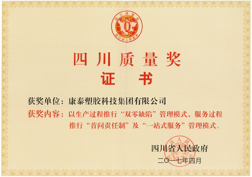 三是質(zhì)量強(qiáng)企,獲得第四屆四川質(zhì)量獎??堤┘瘓F(tuán)以“圍繞全球顧客、不斷改善,追求產(chǎn)品零缺陷”的質(zhì)量方針,貫徹“產(chǎn)品如人品”的質(zhì)量理念,全面覆蓋ISO9001、ISO14001、OHSAS18001三體系,實(shí)施全員、全面質(zhì)量管理,通過導(dǎo)入PDCA循環(huán)管理和QCC體系,嚴(yán)格質(zhì)檢把控,確保從原料進(jìn)廠到產(chǎn)品出廠的優(yōu)質(zhì)質(zhì)量保障。康泰先后榮獲全國質(zhì)量誠信標(biāo)桿典型企業(yè)、全國質(zhì)量檢驗(yàn)穩(wěn)定合格產(chǎn)品、全國百佳質(zhì)量誠信標(biāo)桿示范企業(yè)等榮譽(yù)稱號。2017年,憑借“生產(chǎn)過程推行‘雙零缺陷’管理模式,即供應(yīng)鏈來料100%合格進(jìn)廠、產(chǎn)品質(zhì)量100%合格出廠,始終貫徹執(zhí)行態(tài)度零容忍、質(zhì)量零缺陷的‘雙零缺陷’管理模式”。康泰集團(tuán)從全省眾多優(yōu)秀企業(yè)中脫穎而出,成為唯一獲得第四屆“四川質(zhì)量獎”的塑膠建材企業(yè)。