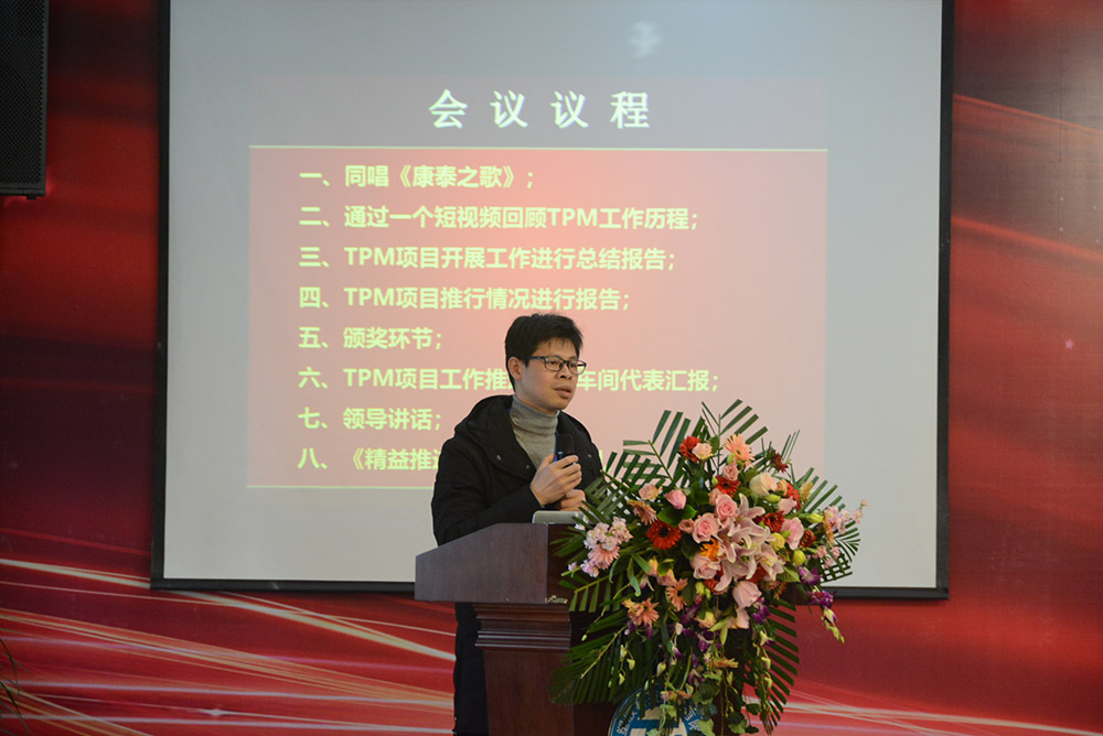 會議首先通過視頻回顧了TPM項目的導(dǎo)入、實施、改善,并對成果進(jìn)行了展示。隨后,TPM項目組組長、生產(chǎn)副總監(jiān)李志堅作了《TPM項目開展工作進(jìn)行總結(jié)匯報》。為了提升康泰集團(tuán)在塑膠行業(yè)的競爭力,滿足客戶日益多樣化的需求,2017年9月28日,康泰集團(tuán)導(dǎo)入了TPM——全面生產(chǎn)管理體系,圍繞TPM的自主維護(hù)、專業(yè)維護(hù)、現(xiàn)場改善及可視化等開展活動。通過活動的開展,生產(chǎn)系統(tǒng)各級對于TPM有了深刻的認(rèn)識,車間員工學(xué)到了知識,提升了技能,對設(shè)備的傳統(tǒng)觀念有了轉(zhuǎn)變。截止2019年1月,現(xiàn)場發(fā)現(xiàn)問題7035項,整改6590項,整改率98% 。建立集團(tuán)設(shè)備預(yù)防性維修保養(yǎng)體系,形成階段性標(biāo)準(zhǔn)化文件8份,設(shè)備故障率下降30% 。