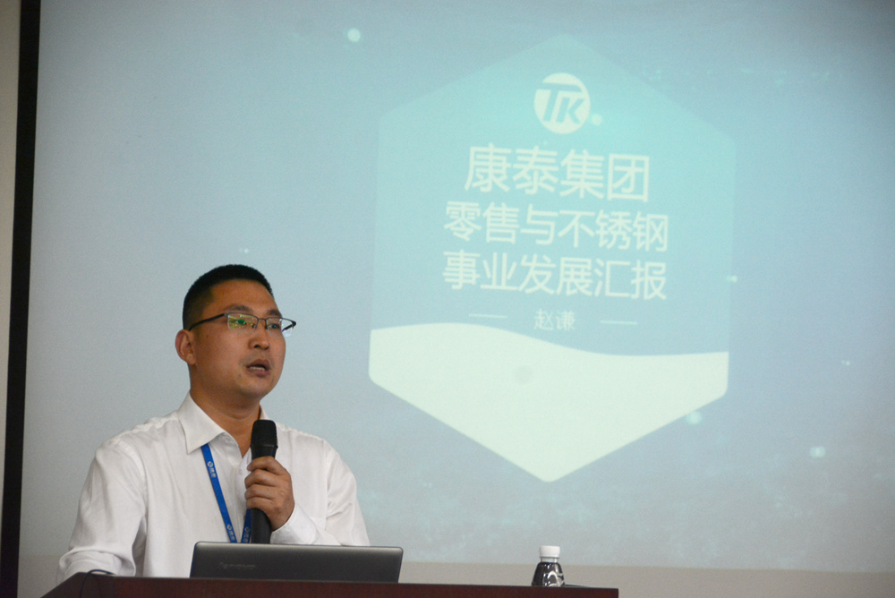 圖為會零售事業(yè)部總經(jīng)理兼不銹鋼事業(yè)部副總經(jīng)理趙謙作匯報